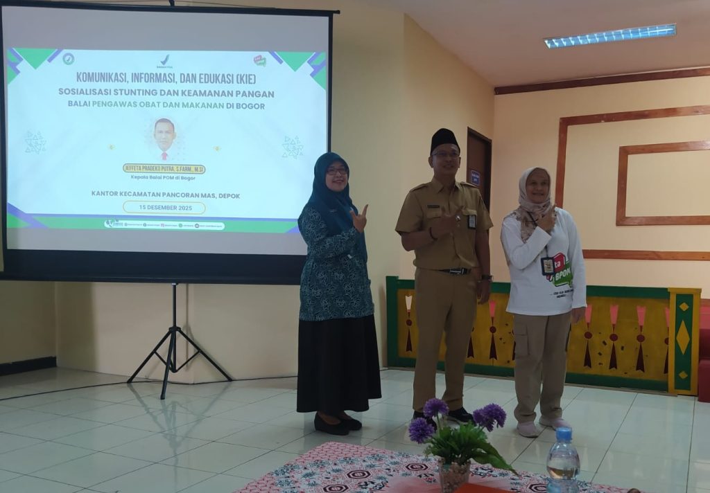 Depok, Telescopemagz | Balai POM (Pengawas Obat dan Makanan) di Bogor, bekerjasama dengan kantor kecamatan Pancoran Mas Depok, telah mengadakan giat Sosialisasi Pencegahan Stunting dan Keamanan pangan, bertempat di Aula kantor kec Pancoran Mas, Jl Kartini no 9 pada Senin (15/12/2025). Adapun undangan peserta acara ini berjumlah 60 orang, yang merupakan perwakilan dari tiap PKK kecamatan dan seluruh kelurahan yang berada di wilayah kec Pancoran Mas.